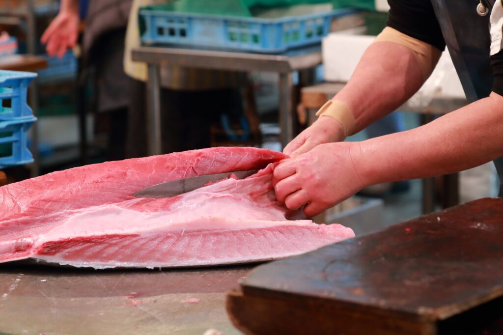 Toyosu Market experts prepare fresh tuna. See this essential Tokyo culinary scene up close.