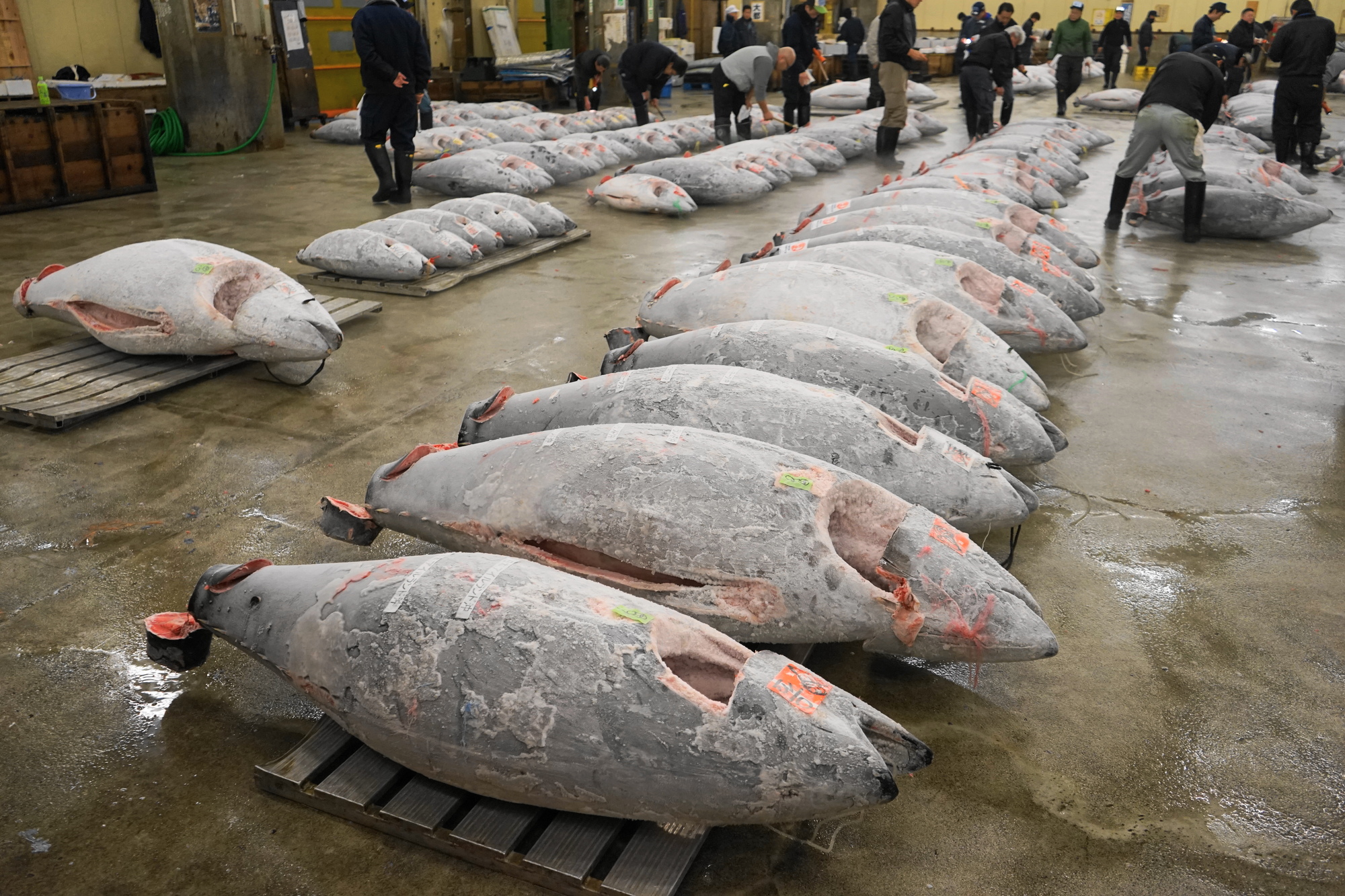 Witness the iconic pre-auction display of giant frozen tuna at Tokyo's Toyosu Market.